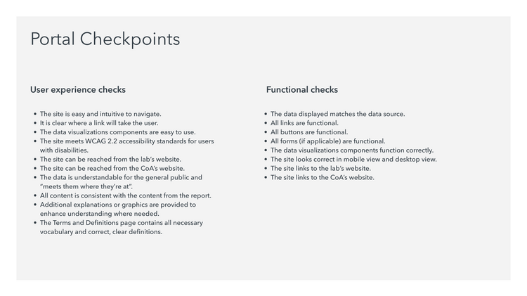As the UX designer, I took ownership of the project, driving progress through initial content review, extensive content edits, content research and fact-checking, image sourcing, design of supporting graphics and charts, design of the data portal concept, and coordination between team members.